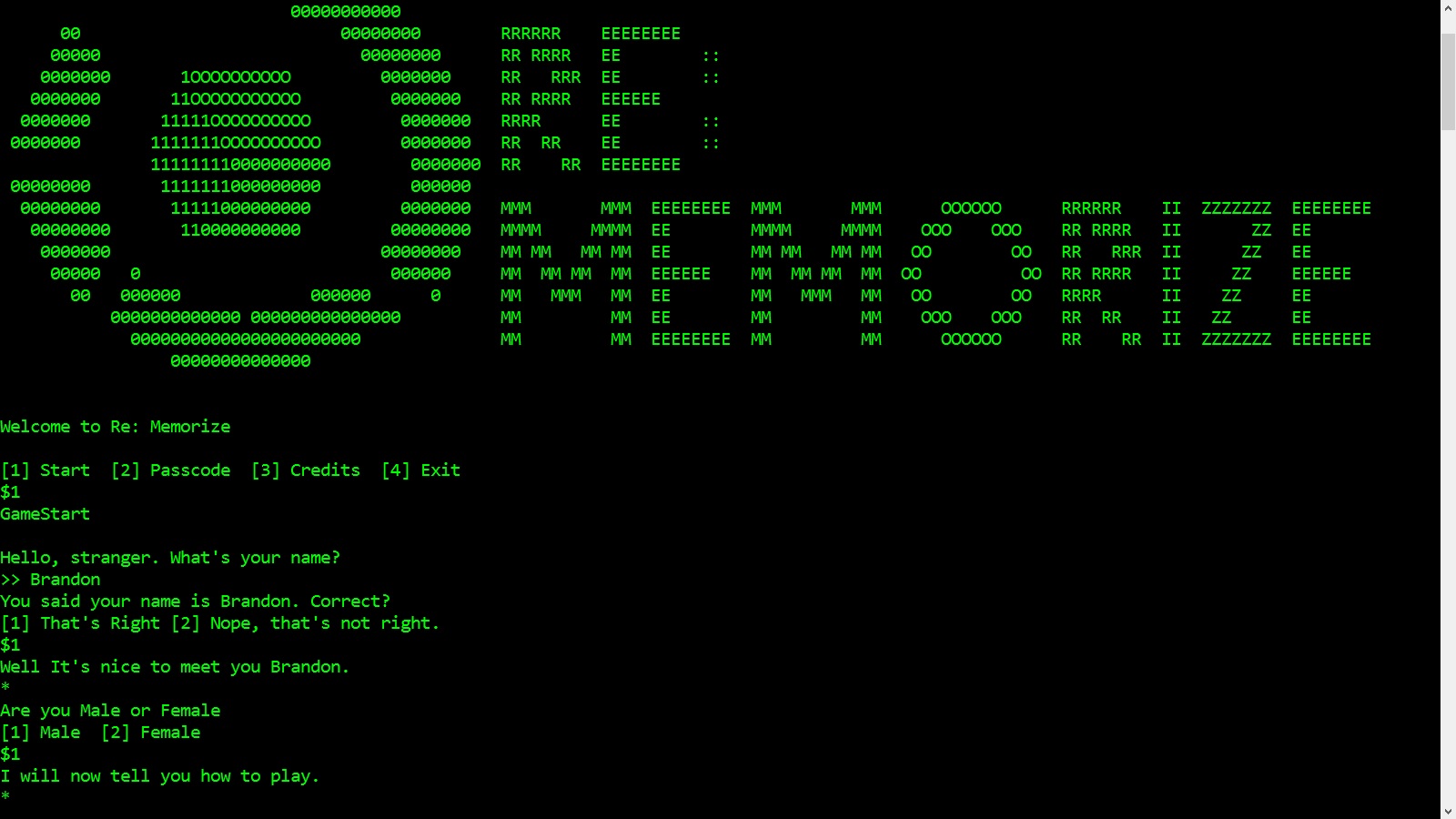 Re: Memorize (Choose Your Own Aventure, Terminal Game)